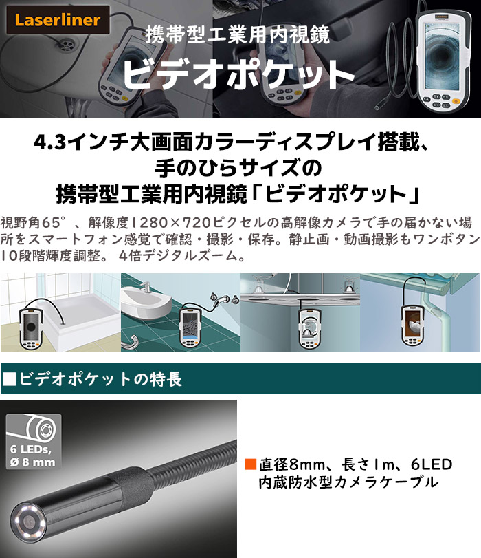 Laserliner ファイバースコープ 携帯型 工業用内視鏡 ビデオポケット スコープ 4.3インチ 小型カメラ カメラ