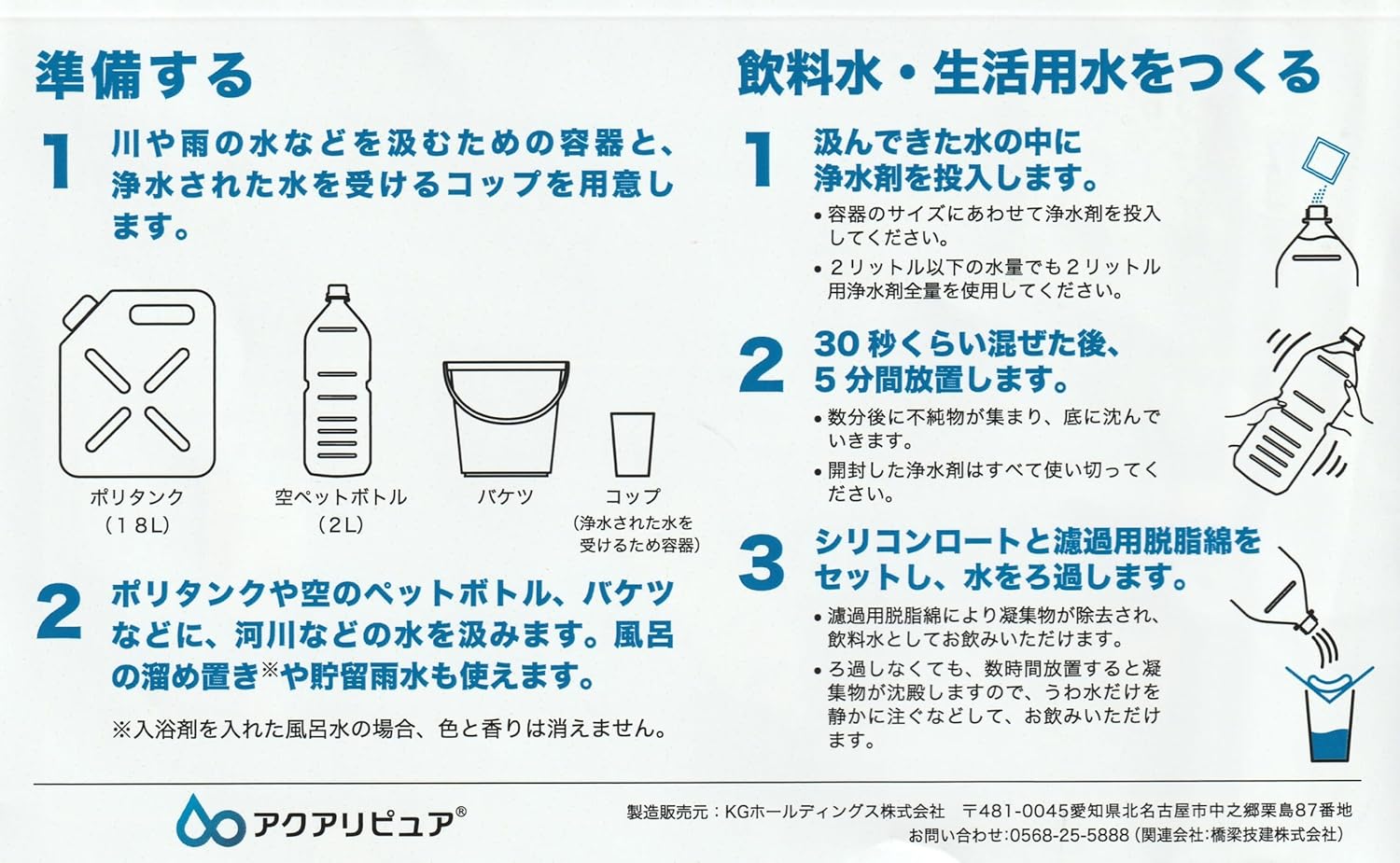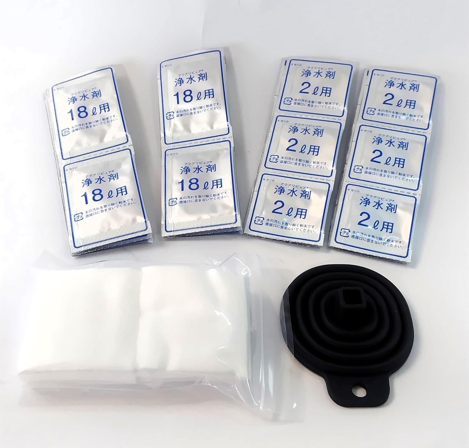 | 浄水剤に含まれている成分 | ・ポリグルタミン酸架橋物(納豆のネバネバ成分) ・硫酸カルシウム(豆腐を固めるにがり) ・炭酸ナトリウム(こんにゃくの凝固剤) ・次亜塩素酸生成パウダー(水道水にも含まれている消毒用塩素) |